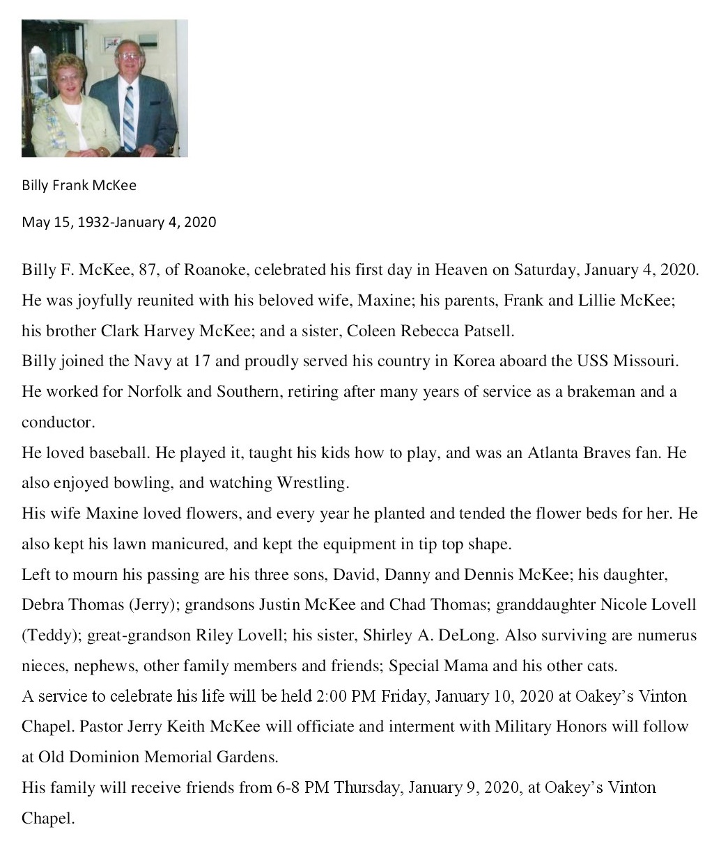 - Billy Frank McKee, of Roanoke, was born on May 15, 1932 to Frank and Lillie McKee. He married Maxine. They had four children: David, Danny, Dennis, and Debra. Billy McKee died on January 4, 2020, and is buried in Old Dominion Memorial Gardens. He lived in Roanoke.