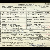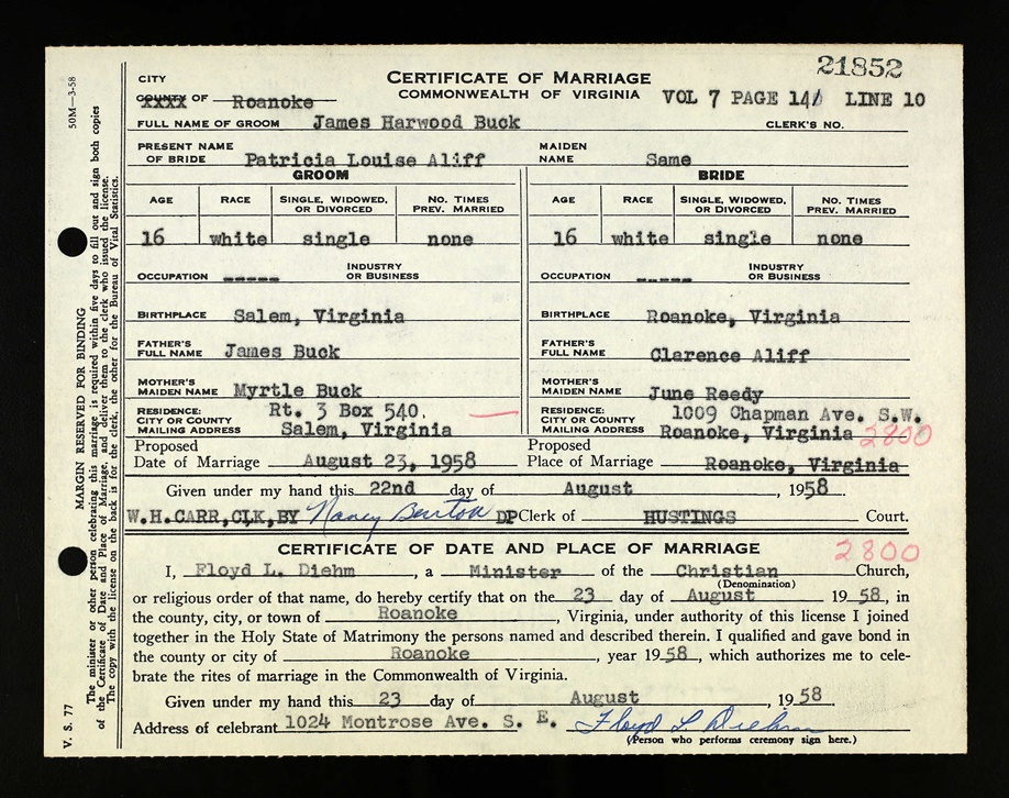 - Image 2 - Certificate of Marriage for James Harwood Buck and Patricia Louise Aliff, with a proposed date of marriage of August 23, 1958.