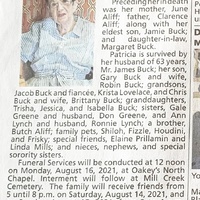 - Patricia Louise Aliff Buck, of Salem, was born on August 23, 1942 to June Aliff and Clarence Aliff. She married James Harwood Buck on August 22, 1958. They had two children, Jamie Buck and Gary Buck. Patricia Buck died on August 11, 2021, and is buried in Mill Creek Cemetery.