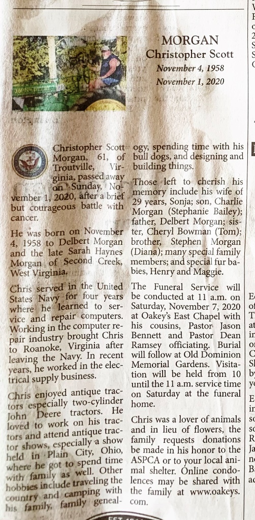 - Christopher Scott Morgan was born on November 4, 1958 in Second Creek, West Virginia to Sarah Haynes Morgan and Delbert Morgan. He married Sonja. They had one child, Charlie Morgan. Christopher Morgan died on November 1, 2020, and is buried in Old Dominion Memorial Gardens. He lived in Troutville.