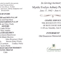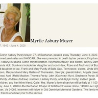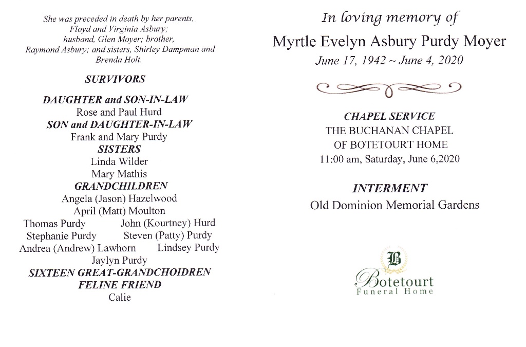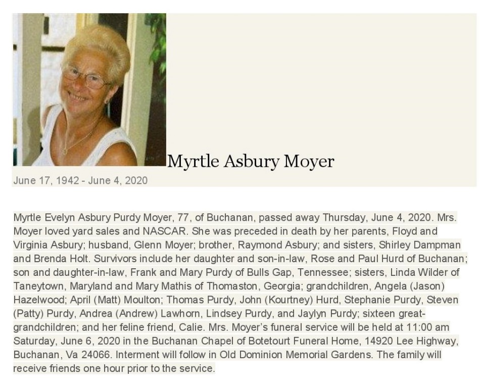 - Myrtle Evelyn Asbury Moyer, of Buchanan, was born on June 17, 1942 to Floyd and Virginia Asbury. She married Glenn Moyer. They had two children, Rose Hurd and Frank Purdy. Myrtle Moyer died on June 4, 2020, and is buried in Old Dominion Memorial Gardens.