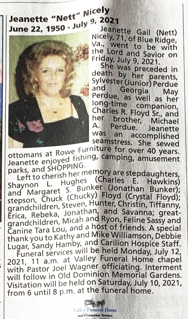 - Jeanette "Nett" Nicely was born on June 22, 1950 to Sylvester (Junior) Perdue and Georgia May Perdue. Her longtime companion was Charles R. Floyd Sr. She had three step-children: Shaynon L. Hughes, Margaret S. Bunker, and Chuck Floyd. Jeanette Nicely died on July 9, 2021, and is buried in Old Dominion Memorial Gardens. She lived in Blue Ridge.