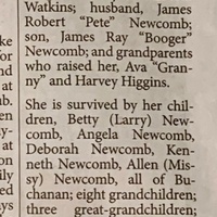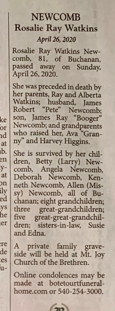 - Rosalie Ray Watkins Newcomb was born in 1939 to Ray and Alberta Watkins. She married James Robert "Pete" Newcomb. They had six children: James Ray "Booger", Betty, Angela, Deborah, Kenneth, and Allen. Rosalie Newcomb died on April 26, 2020, and is buried in Mt. Joy Church of the Brethren. She lived in Buchanan.