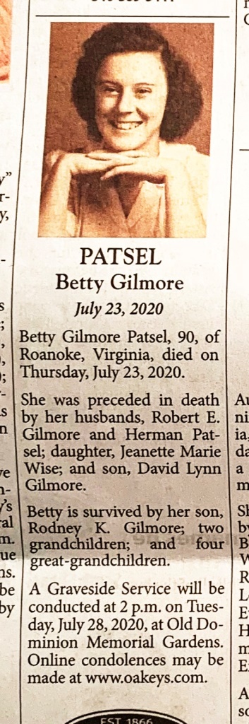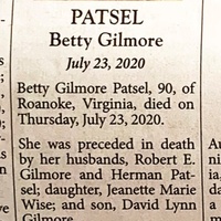 - Betty Gilmore Patsel was born in 1930. She married Robert E. Gilmore and Herman Patsel. She had three children: Jeanette Marie Wise, Rodney K. Gilmore, and David Lynn Gilmore. Betty Gilmore Patsel died on July 23, 2020, and is buried in Old Dominion Memorial Gardens. She lived in Roanoke.