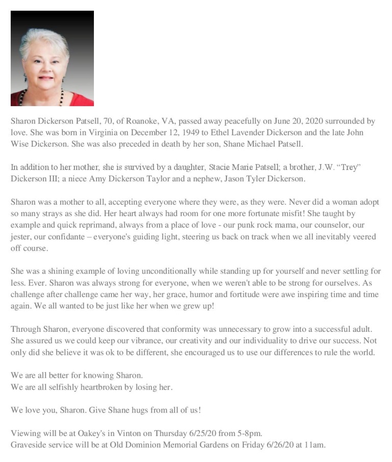 - Sharon Dickerson Patsell was born on December 12, 1949 to Ethel Lavender Dickerson and John Wise Dickerson. She had two children, Shane Michael Patsell and Stacie Marie Patsell. Sharon Patsell died on June 20, 2020, and is buried in Old Memorial Gardens. She lived in Roanoke.