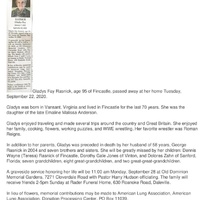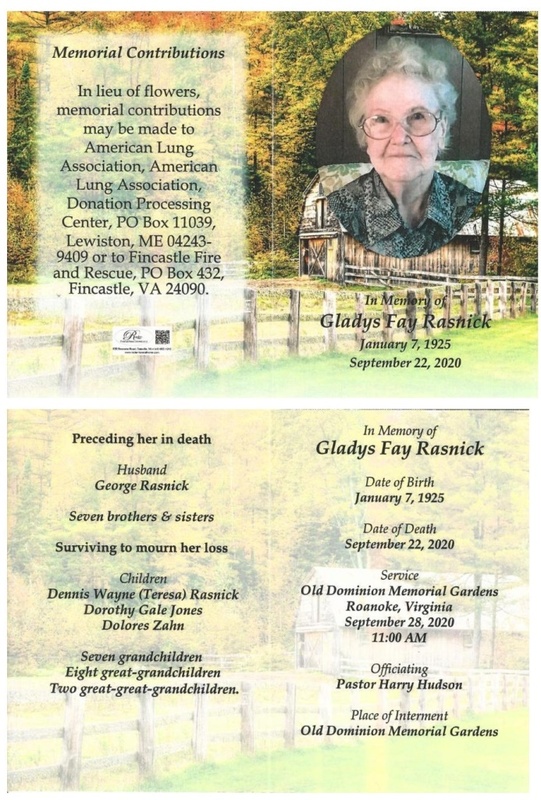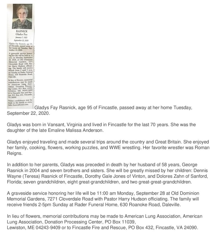 - Gladys Fay Rasnick was born on January 7, 1925 in Vansant, Virginia to Emaline Malissa Anderson. She married George Rasnick. They had three children: Dennis Wayne Rasnick, Dorothy Gale Jones, and Dolores Zahn. Gladys Rasnick died on September 22, 2022, and is buried in Old Dominion Memorial Gardens. She lived in Fincastle.