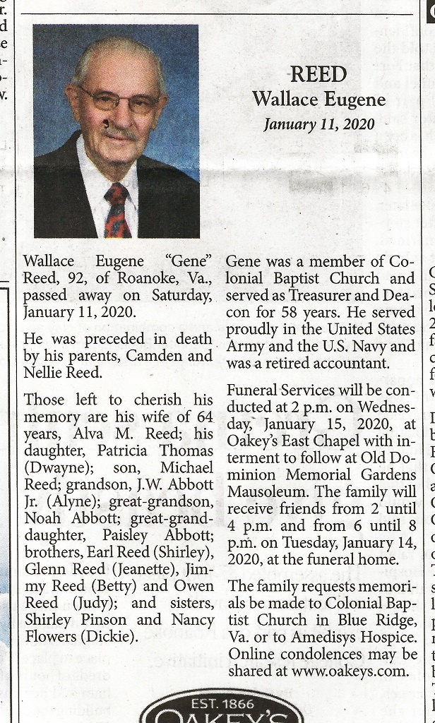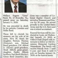 - Wallace Eugene "Gene" Reed was born in 1938 to Camden and Nellie Reed. He married Alva M. Reed. They had two children, Patricia Thomas and Michael Reed. Wallace Reed died on January 11, 2020, and is buried in Old Dominion Memorial Gardens. He lived in Roanoke.