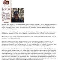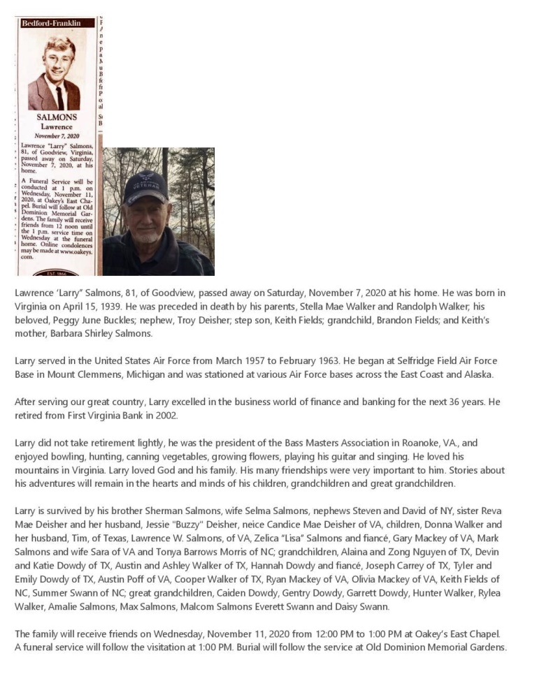 - Lawrence "Larry" Salmons was born on April 15, 1939 in Virginia to Stella Mae Walker and Randolph Walker. He married Peggy June Buckles. They had five children, Donna Walker, Lawrence w. Salmons, Zelica "LIsa" Salmons, Mark Salmons, and Tonya Barros Morris. Lawrence Salmons died on November 7, 2020, and is buried in Old Dominion Memorial Gardens. He lived in Goodview