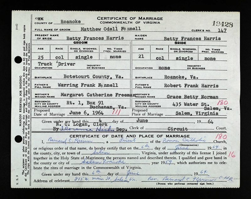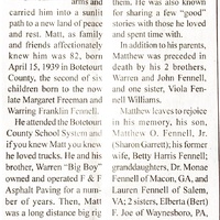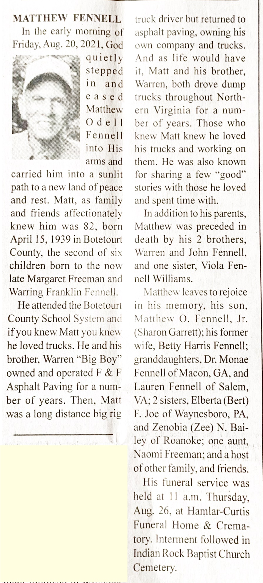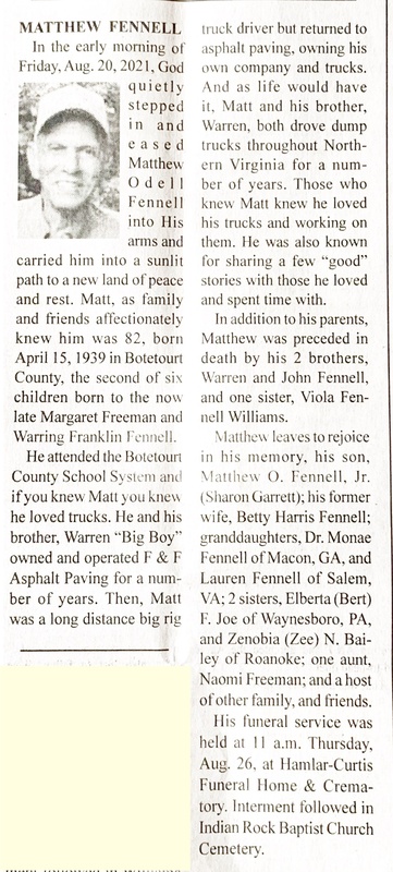 - Matthew Odell Fennell was born April 15, 1939 in Botetourt County to Margaret Freeman Fennell and Warring Franklin Fennell. He married Betty Frances Harris in 1964, and they divorced in 1990. He had a son, Matthew O. Fennell, Jr. He died August 20, 2021, and is buried in Indian Rock Baptist Church Cemetery.