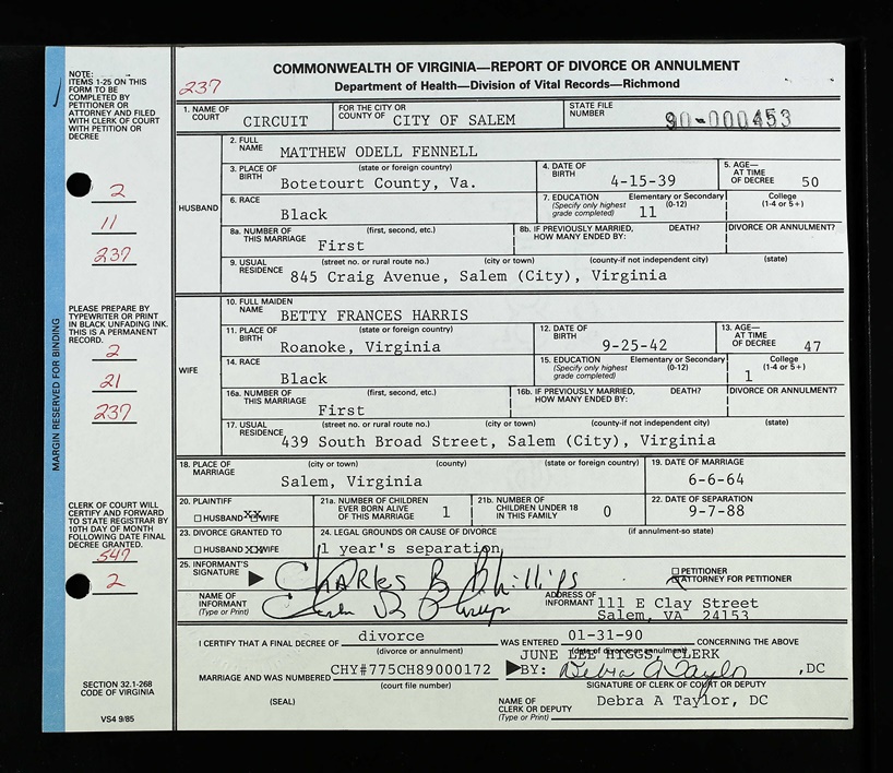 - Image 3 - Divorce Decree between Matthew Odell Fennell and Betty Frances Harris.
