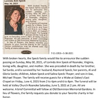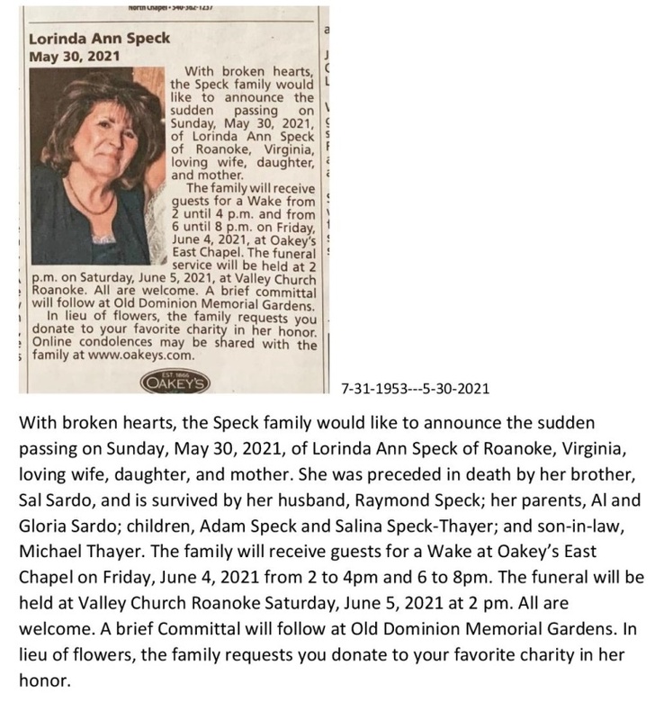 - Lorinda Ann Speck was born on July 31, 1953 to Al and Gloria Sardo. She married Raymond Speck. They had two children, Adam Speck and Salina Speck-Thayer. Lorinda Speck died on May 30, 2021, and is buried in Old Dominion Memorial Gardens. She lived in Roanoke