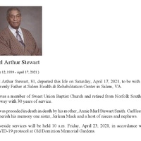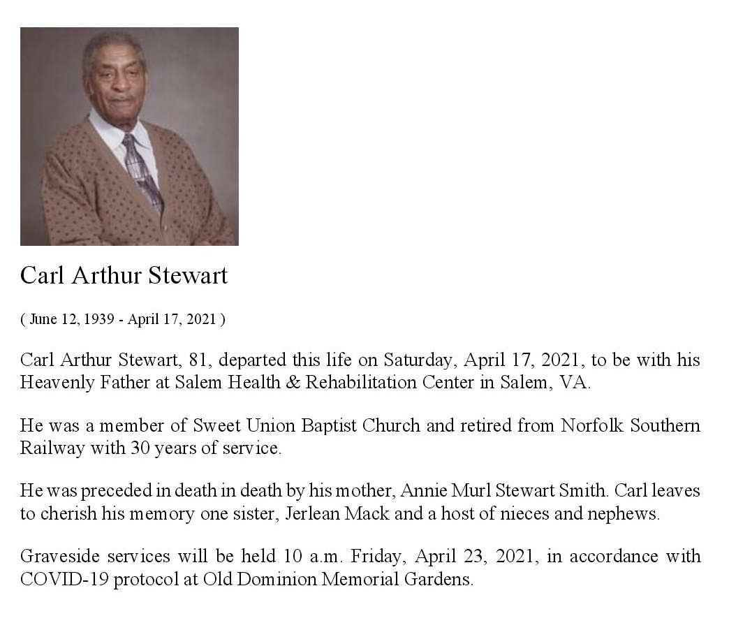 - Carl Arthur Stewart was born on June 12, 1939 to Annie Murl Stewart Smith. He is survived by his sister, Jerlean Mack. Carl Stewart died on April 17, 2021, and is buried in Old Dominion Memorial Gardens. He lived in Salem.