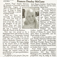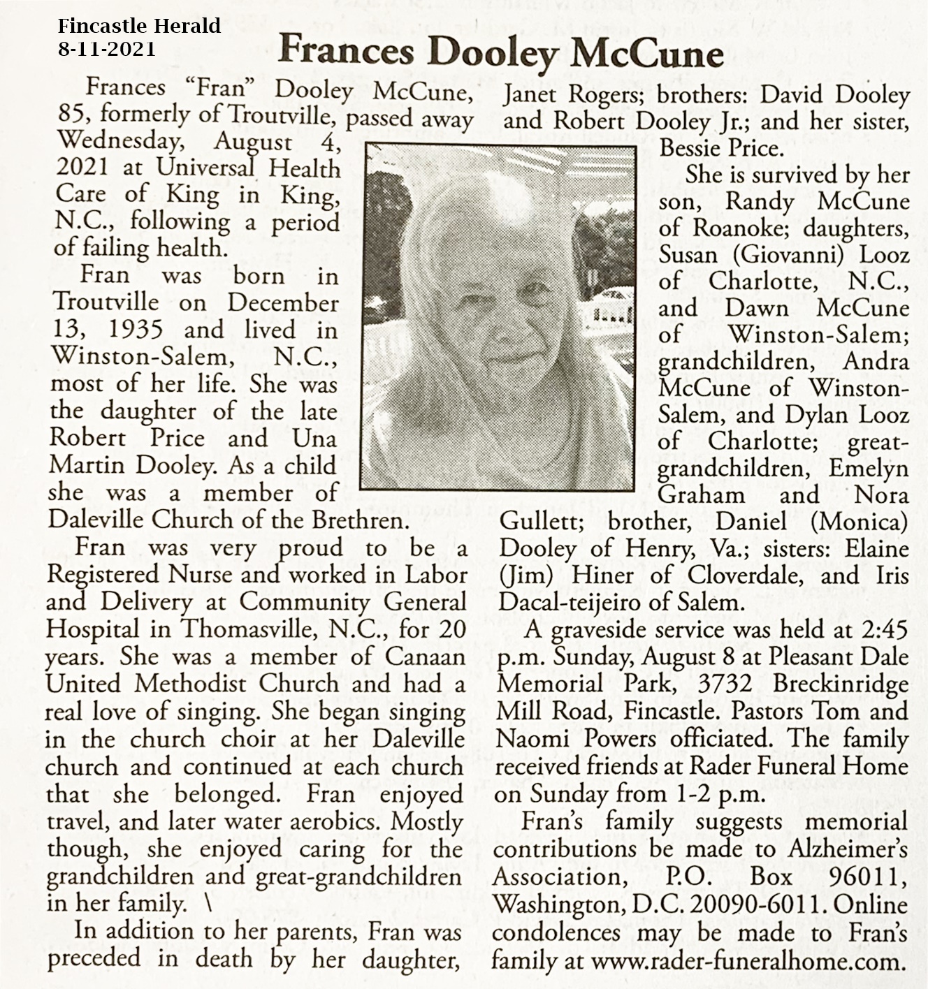 - Frances "Fran" Dooley McCune was born in Troutville on December 13, 1935 to Robert Price and Una Martin Dooley. She had four children: Janet Rogers, Randy McCune, Susan Looz, and Dawn McCune. Frances McCune died on August 4, 2021, and is buried in Pleasant Dale Memorial Park.