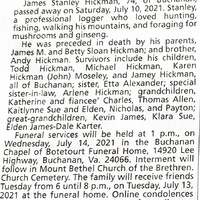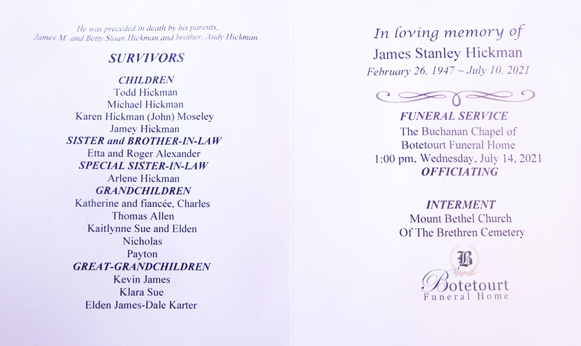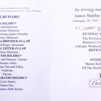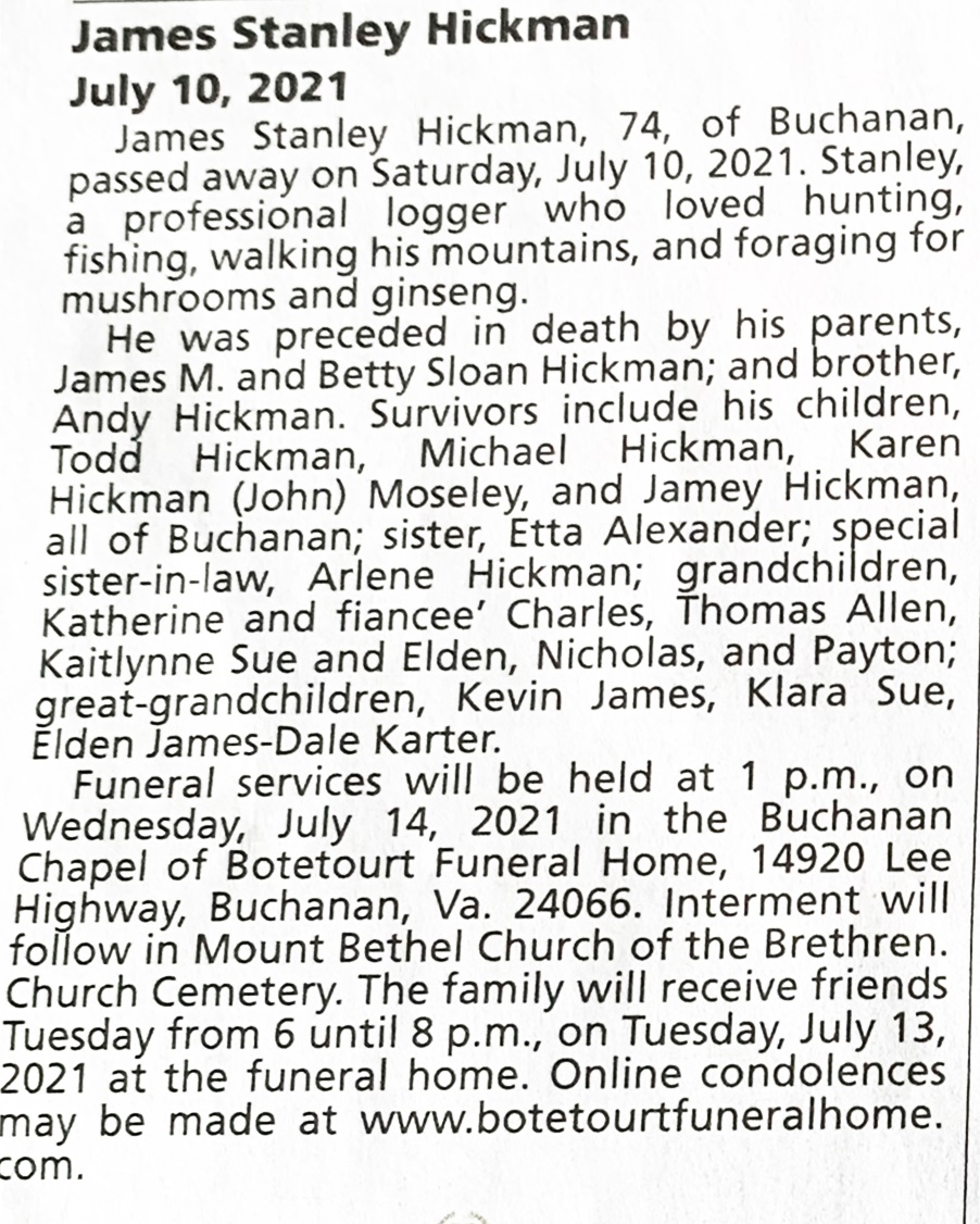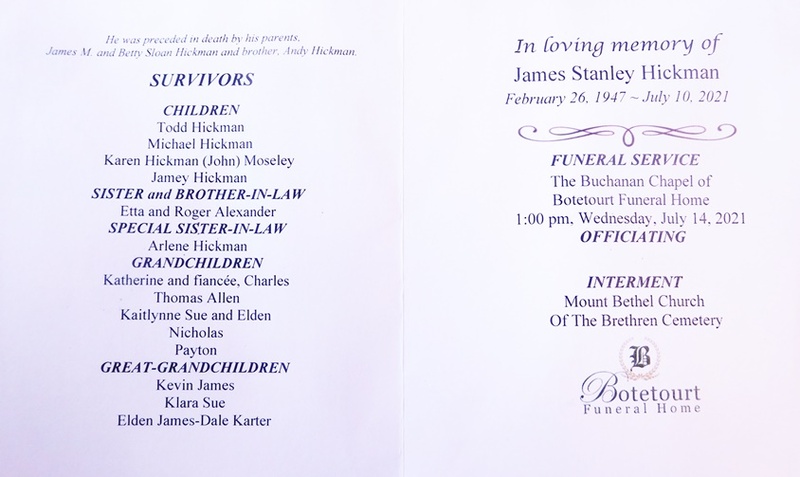- James Hickman was born in 1947 to James M. and Betty Sloan Hickman. He married and divorced Katherine Sue Crouch Hickman. He had four children: Todd Hickman, Michael Hickman, Karen Hickman Mosely, and James Hickman. He lived in Buchanan, died in 2021, and is buried at Mount Bethel Church of the Brethren Church Cemetery.