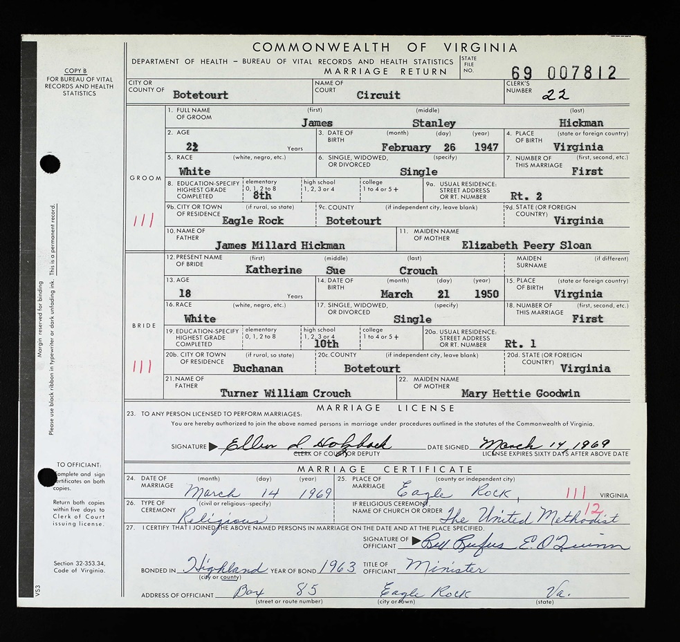 - Image 2 - Marriage Certificate for James Stanley Hickman and Katherine Sue Crouch, dated March 14, 1969.