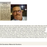 - Michael Todd Tyree Sr. was born on June 29, 1967 to Matthew Tyree and Linda Carter Tyree. He married Julie Moran Tyree. They had two children, Michael Tyree and Amber Embry. Michael Tyree Sr. died on July 4, 2020, and is buried in Old Dominion Memorial Gardens. He lived in Troutville.