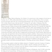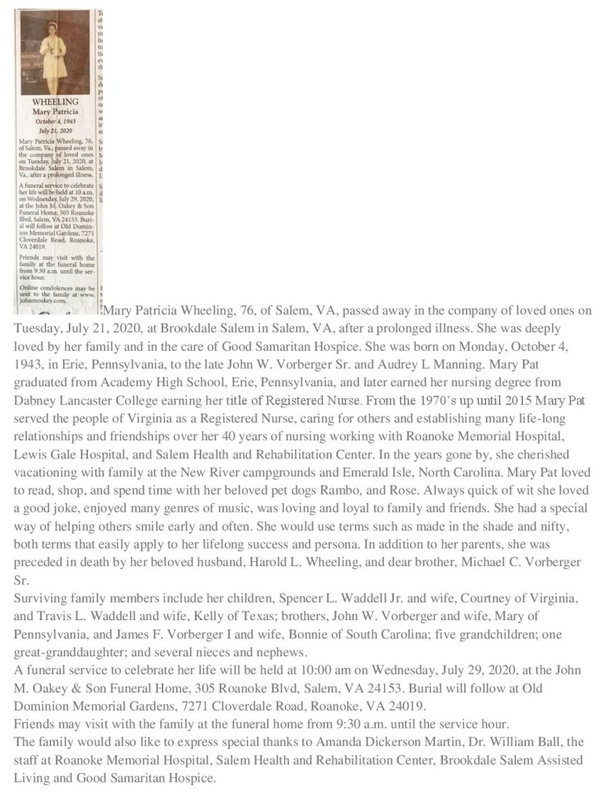 - Mary Patricia Wheeling was born on October 4, 1943 in Eric, Pennsylvania to John W. Vorberger Sr. and Audrey L. Manning. She married Harold L. Wheeling. They had two children, Spencer and Travis. Mary Wheeling died on July 21, 2020, and is buried in Old Dominion Memorial Gardens. She lived in Salem.