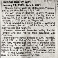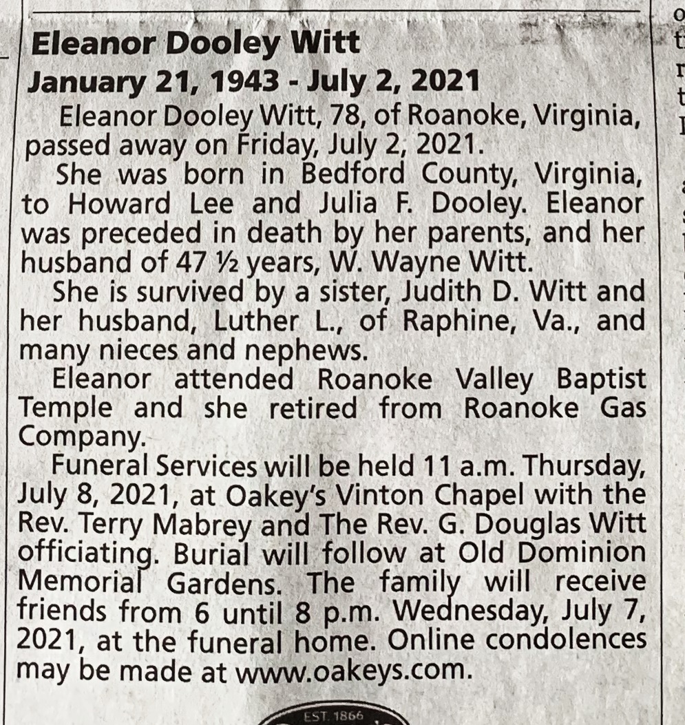 - Eleanor Dooley Witt was born on January 21, 1943 in Bedford County to Howard Lee and Julia F. Dooley. She married W. Wayne Witt. She is survived by a sister, Judith D. Witt. Eleanor Witt died on July 2, 2021, and is buried in Old Dominion Memorial Gardens.