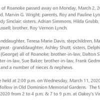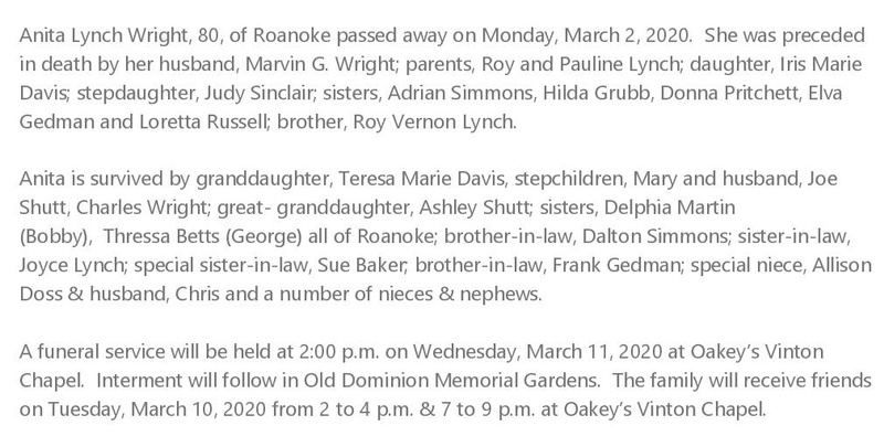 - Anita Lynch Wright was born to Roy and Pauline Lynch. She married Marvin G. Wright. She had one daughter, Iris Marie Davis, and one stepdaughter, Judy Sinclair. Anita Wright died on March 2, 2020, and is buried in Old Dominion Memorial Gardens. She lived in Roanoke.