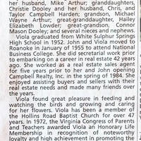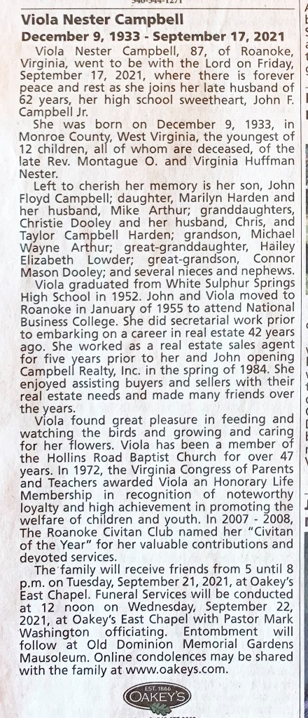 - Viola Nester Campbell was born on December 9, 1933 in Monroe County, West Virginia to Rev. Montague O. and Virginia Huffman Nester. She married John F. Campbell Jr. They had two children, Marilyn Harden and John Floyd Campbell. Viola Campbell died on September 17, 2021, and is buried in Old Dominion Memorial Gardens. She lived in Roanoke.