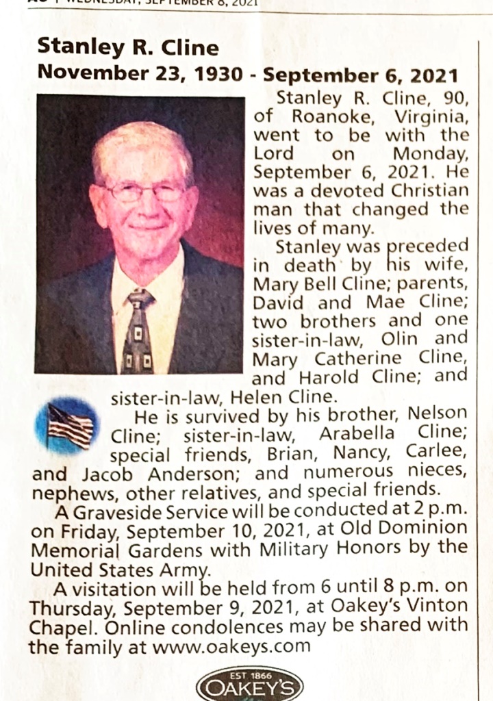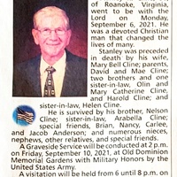 - Stanley R. Cline was born on November 23, 1930 to David and Mae Cline. He had three brothers: Olin, Harold, and Nelson. He married Mary Bell Cline. Stanley Cline died on September 6, 2021, and is buried in Old Dominion Memorial Gardens. He lived in Roanoke