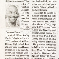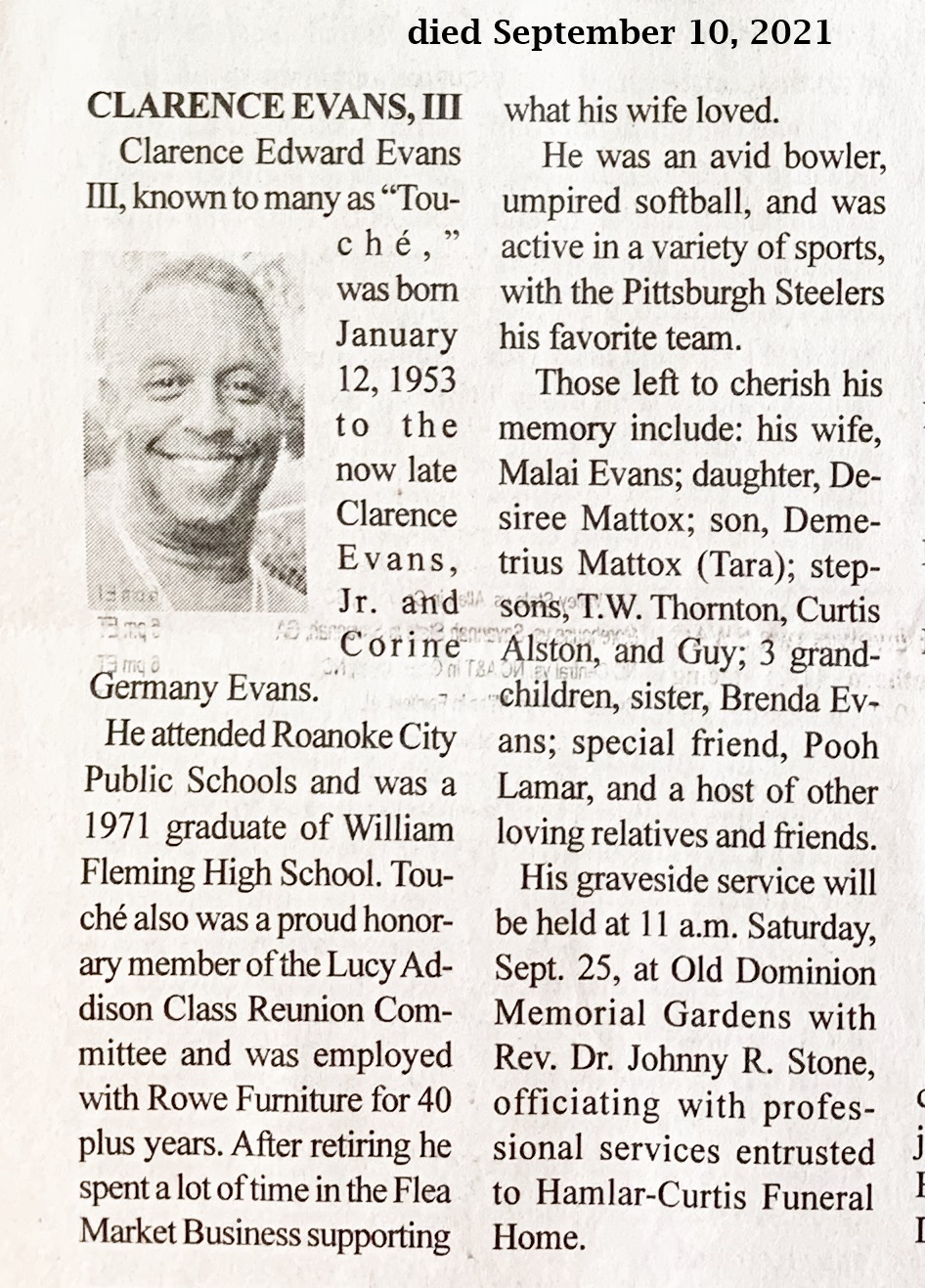 - Clarence Edward Evans III, known as "Touché", was born in 1953 to Clarence Evans, Jr. and Corine Germany Evans. He married Malai Evans. They had two children, Desiree Mattox and Demetrius Mattox. He has three stepchildren: T.W. Thornton, Curtis Alston, and Guy. Clarence Evans III died on September 10, 2021, and is buried in Old Dominion Memorial Gardens.