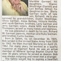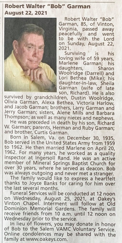 - Robert Walter "Bob" Garman was born in 1936 in Salem, Virginia to Herman and Ruby Garman. He had three siblings: Alene, Barbara, and Curtis. He married Marlene on April 20, 1962. They had three children: Sharon, Lori, and Richard. Robert Garman died on August 22, 2021, and is buried in Old Dominion Memorial Gardens. He lived in Vinton.