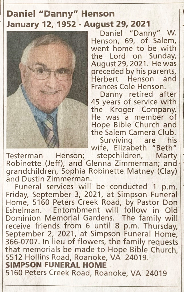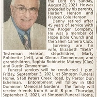 - Daniel "Danny" Henson was born in 1952 to Herbert Henson and Frances Cole Henson. He married Elizabeth "Beth" Testerman Henson. He had two stepchildren, Marty Robinette and Glenna Zimmerman. Daniel Henson died on August 29, 2021, and is buried in Old Dominion Memorial Gardens. He lived in Salem.