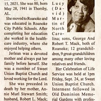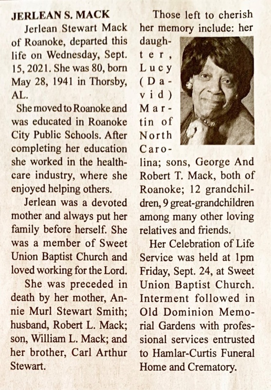 - Jerlean Mack was born in 1941 in Thorsby, Alabama to Annie Murl Stewart Smith. She married Robert L. Mack. They had four children: William L. Mack, Lucy Martin, George Mack and Robert Mack. Jerlean Mack died on September 15, 2021, and is buried in Old Dominion Memorial Gardens. She lived in Roanoke.
