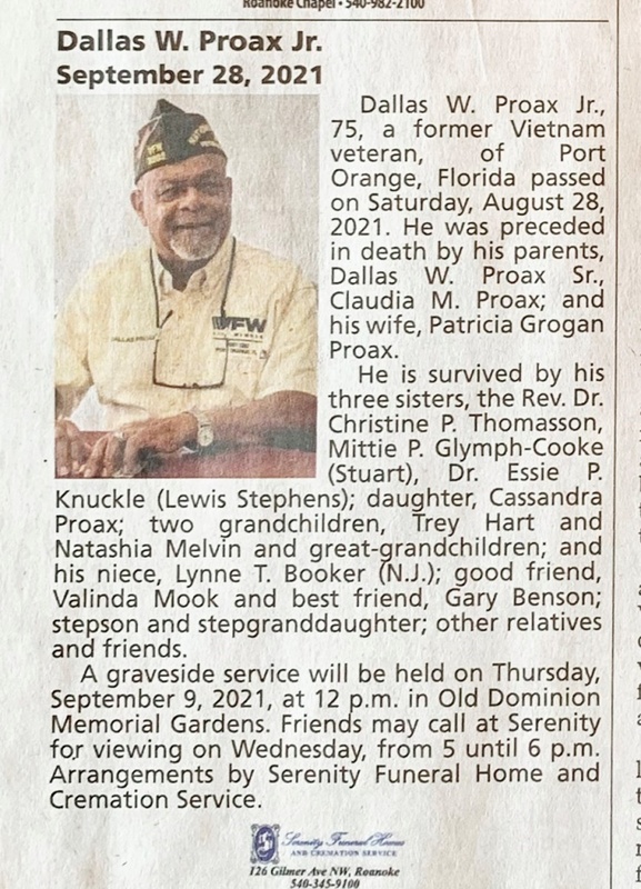 - Dallas Proax Jr. was born in 1946 to Dallas W. Proax Sr. and Claudia M. Proax. he married Patricia Grogan Proax. They had one child, Cassandra. Dallas Proax Jr. died on September 28, 2021, and is buried in Old Dominion Memorial Gardens. He lived in Port Orange, Florida.