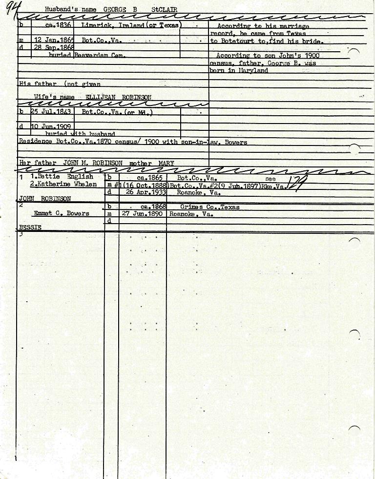 Family worksheet showing local genealogical findings. This is page 94 from the St. Clair family collection, and reads,
