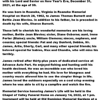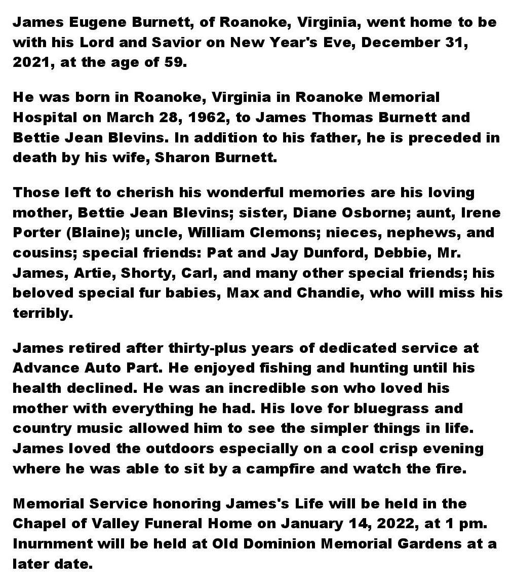 - James Burnett was born in 1962 in Roanoke to James Thomas Burnett and Bettie Jean Blevins. He married Sharon Burnett. James Burnett died on December 31, 2021, and is buried in Old Dominion Memorial Gardens. He lived in Roanoke.