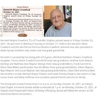 - Kenneth Crawford was born in 1946 in Botetourt County to John Oliver Crawford and Pernie Florence Boothe Crawford. He married Winifred Kathleen Flowers Crawford. They had one child, Teresa Diane Crawford Garrett. Kenneth Crawford died on October 22, 2021, and is buried in Old Dominion Memorial Gardens. He lived in Troutville.