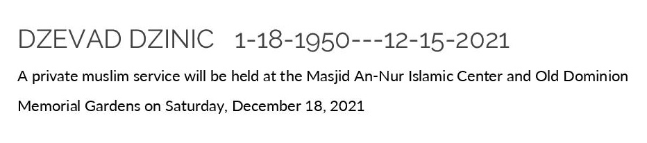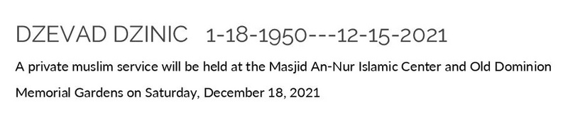 - Dzevad Dzinic was born on 1950. He died on December 15, 2021, and is buried in Old Dominion Memorial Gardens.