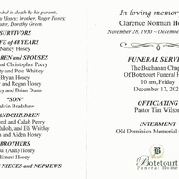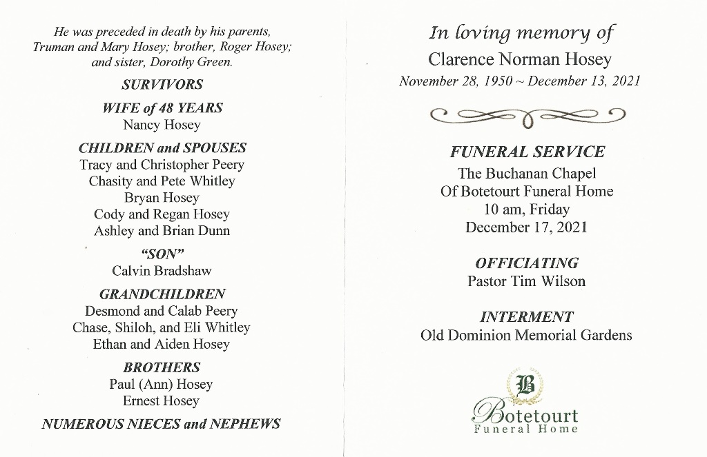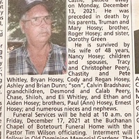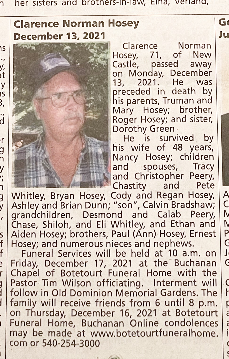 - Clarence Hosey was born on November 28, 1950 to Truman and Mary Hosey. He married Nancy Hosey. They had four children: Tracy Peery, Chastity Whitley, Bryan Hosey, and Cody Hosey. Clarence Hosey died on December 13, 2021, and is buried in Old Dominion Memorial Gardens. He lived in New Castle.