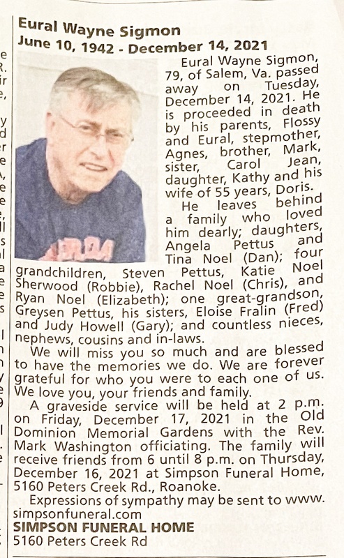 - Eural Sigmon was born in 1942 to Flossy and Eural. He married Doris. They had two children, Angela Pettus and Tina Noel. Eural Sigmon died on December 14, 2021, and is buried in Old Dominion Memorial Gardens. He lived in Salem.