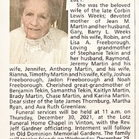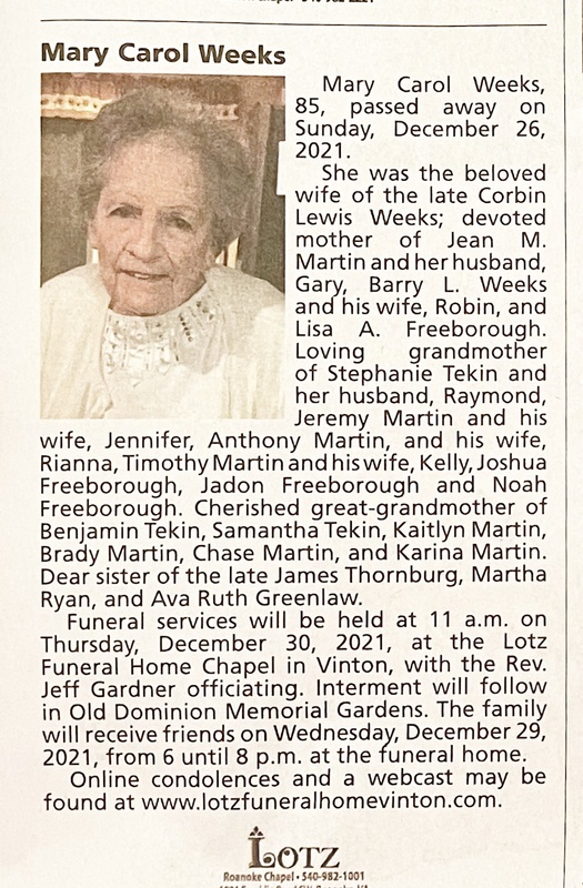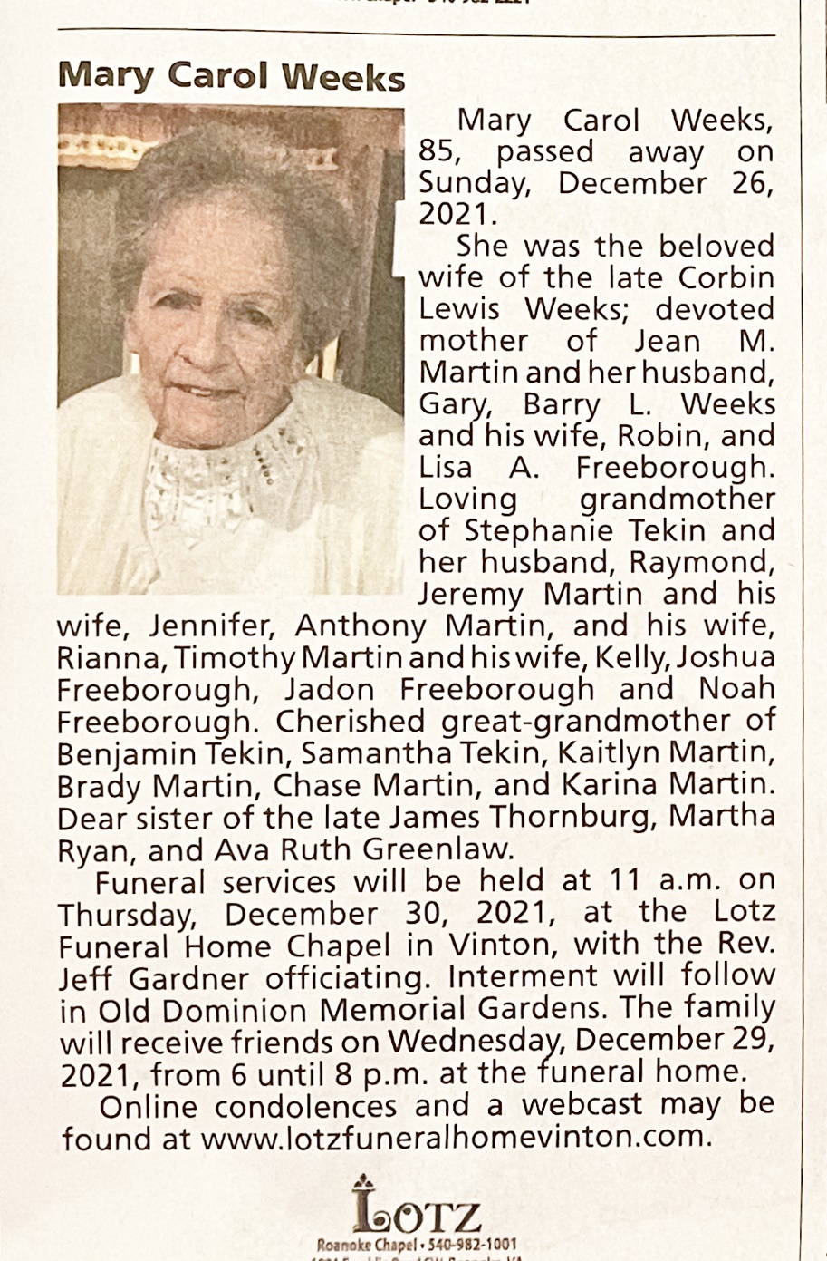 - Mary Weeks was born in 1936. She married Corbin Lewis Weeks. They had three children: Jean M. Martin, Barry L. Weeks, and Lisa A. Fireborough. Mary Weeks died on December 26, 2021, and is buried in Old Dominion Memorial Gardens.
