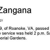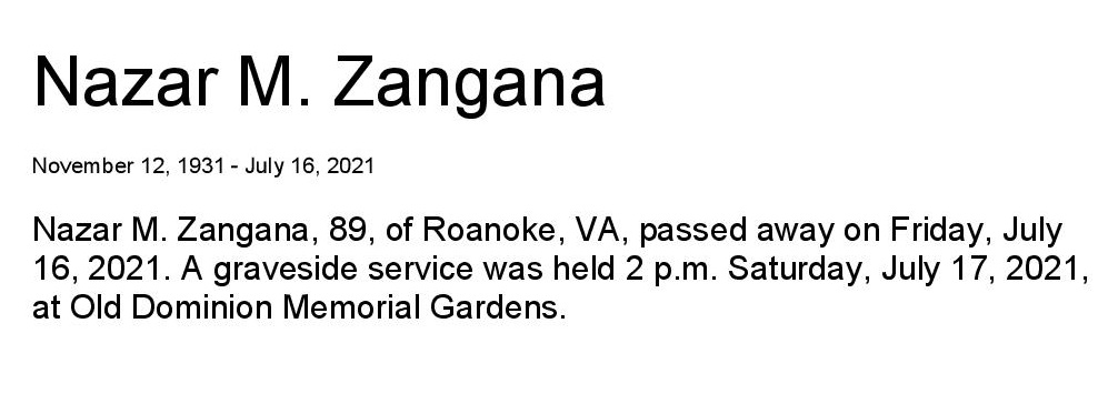 - Nazar Zangana born in 1931 in Roanoke. Nazar Zangana died on July 16, 2021, and is buried in Old Dominion Memorial Gardens.
