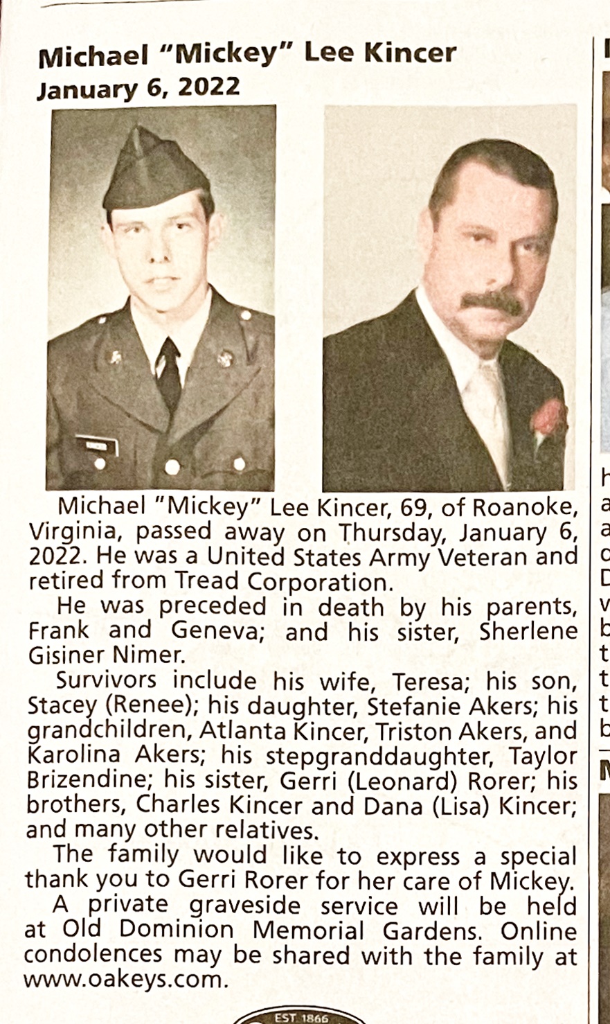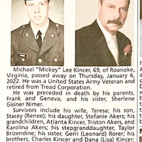 - Michael "Mickey" Lee Kincer was born to Frank and Geneva. He married Teresa. They had two children, Stacey and Stefanie Akers. Michael Kincer died on January 6, 2022, and is buried in Old Dominion Memorial Gardens. He lived in Roanoke.