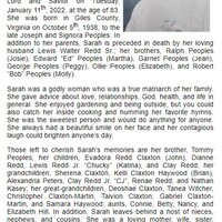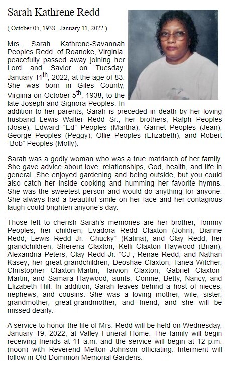 - Sarah Redd was born in Giles County in 1938 to Joseph and Signora Peoples. She married Lewis Walter Redd Sr. They had four children: Evadora Redd Claxton, Dianne Redd, Lewis Redd, Jr., and Clay Redd. Sarah Redd died on January 11, 2022, and is buried in Old Dominion Memorial Gardens. She lived in Roanoke.
