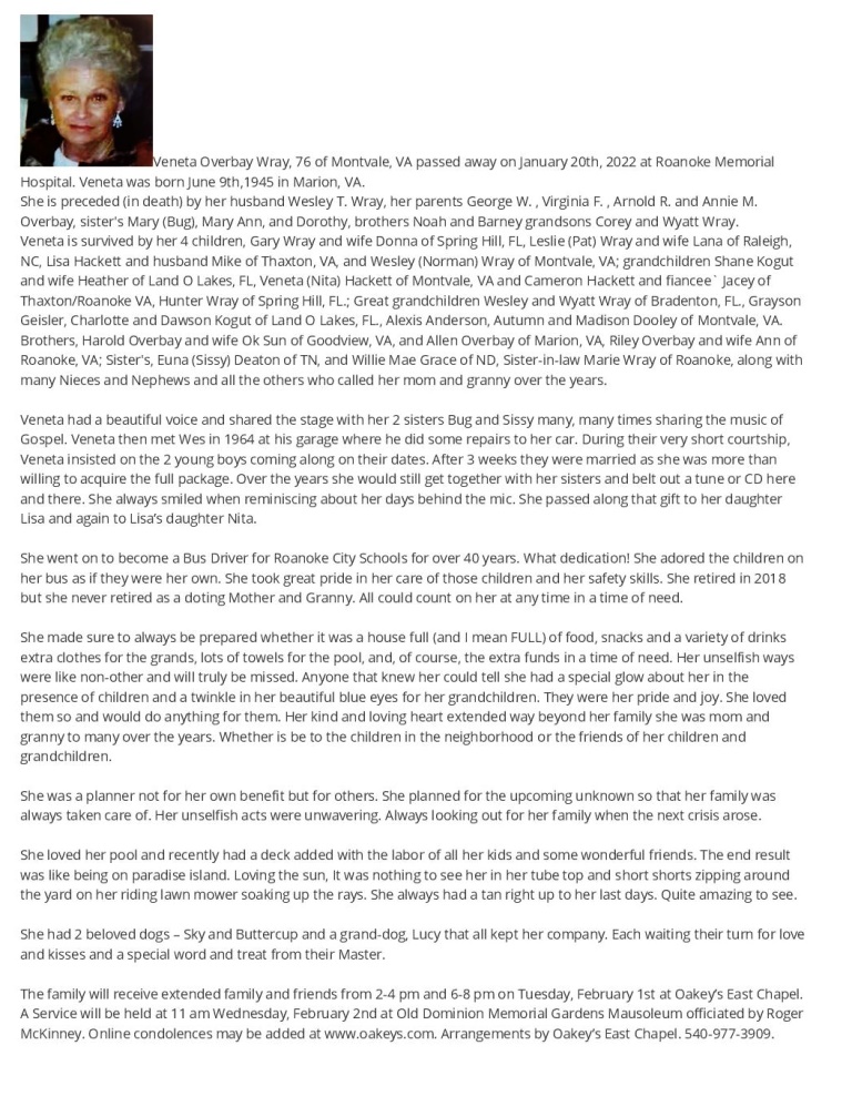 - Veneta Wray was born in 1945 in Marion, Virginia. She married Wesley T. Wray. They had four children: Gary, Leslie, Lisa Hackett, and Wesley. Veneta Wray died on January 20, 2022, and is buried in Old Dominion Memorial Gardens.