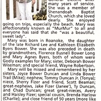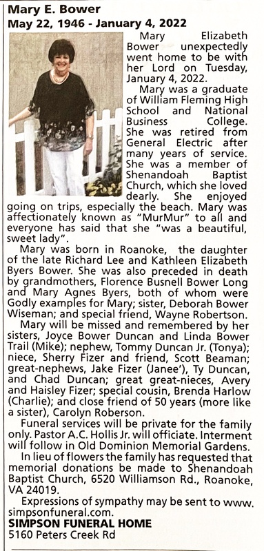 - Mary Bower was born in 1946 in Roanoke to Richard Lee and Kathleen Elizabeth Byers Bower. Mary Bower died on January 4, 2022, and is buried in Old Dominion Memorial Gardens.