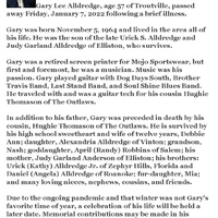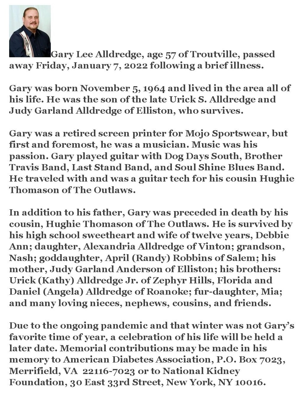 - Gary Allredge was born in 1964 to Urick S. Alldredge and Judy Garland Alldredge. He married Debbie Ann. He had one child, Alexandria Alldredge. Gary Alldredge died on January 7, 2022. He lived in Troutville.