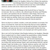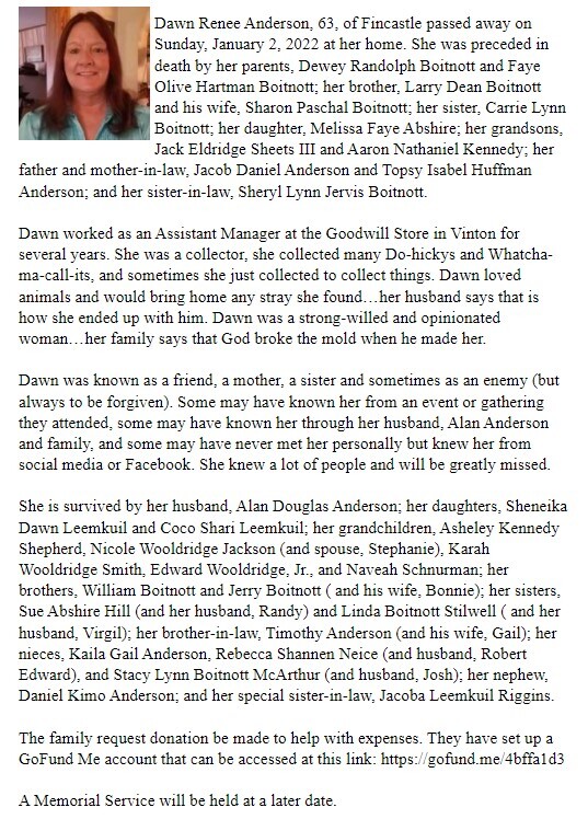 - Dawn Anderson was born in 1958 to Dewey Randolph Boinott and Faye Olive Hartman Boinott. She married Alan Douglas Anderson. They had three children: Sheneika Dawn Leemkull, Coco Shari Leemkull, and Melissa Faye Abshire.