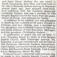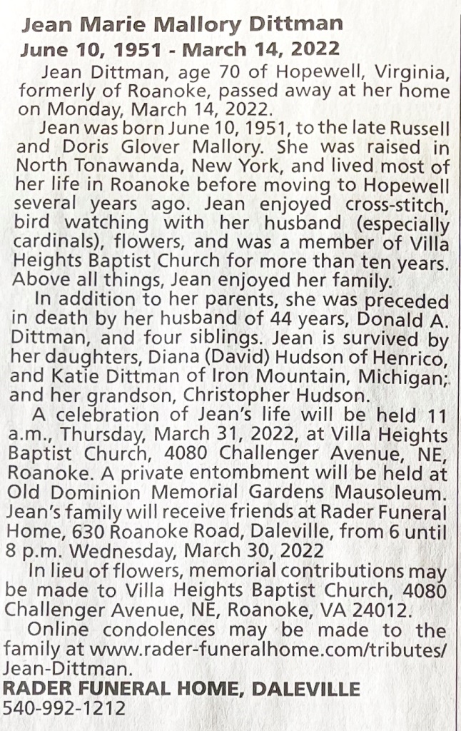 - Jean Dittman was born in 1951 to Russell and Doris Glover Mallory. She married Donald A. Dittman. They had two children, Diana Hudson and Katie Dittman. Jean Dittman died on March 14, 2022, and is buried in Old Dominion Memorial Gardens.