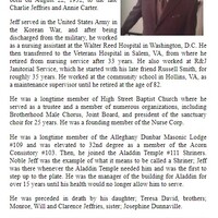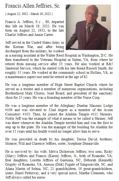 - Francis Jeffries Sr. was born in 1932 to Charlie Jeffries and Annie Carter. He married Melva Dickerson Jeffries. They had seven children: Teresa David, Ricky, Francis Jr., Loretta Jeffries, Deborah Grigsby, Anessa Fugate, and Alana Martin. Francis Jeffries Sr. died on March 19, 2022, and is buried in Old Dominion Memorial Gardens. He lived in Roanoke.