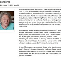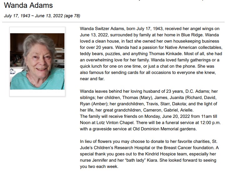 - Wanda Adams was born in 1943. She married D.C. Adams. They had five children: Thomas, James, Juanita, David, and Ryan. Wanda died on June 13, 2022, and is buried in Old Dominion Memorial Gardens. She lived in Blue Ridge.