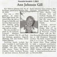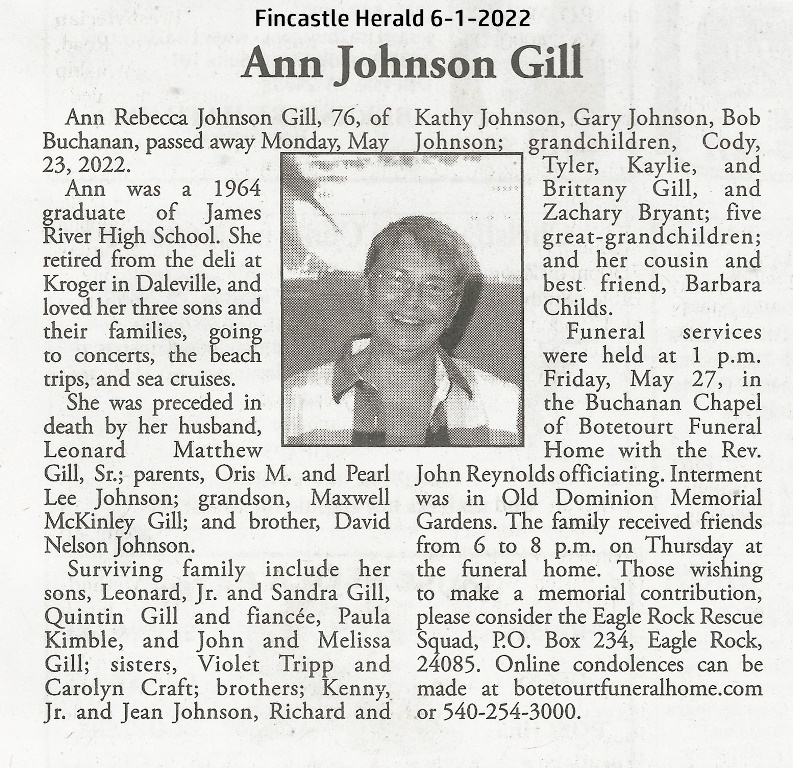 - Ann Gill was born in 1946 to Oris M. and Pearl Lee Johnson. She married Leonard Matthew Gill, Sr. They had three children: Leonard, Jr., Quintin, and John. Ann Gill died on May 23, 2022, and is buried in Old Dominion Memorial Garden. She lived in Buchanan.