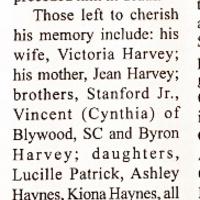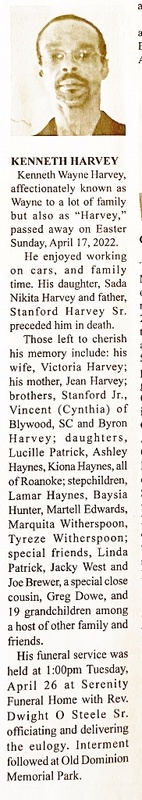 - Kenneth Wayne Harvey, also known as "Wayne" and "Harvey", was born to Jean Harvey and Stanford Harvey Sr. He married Victoria Harvey. He had four daughters: Sada Nikita Harvey, Lucille Patrick, Ashley Haynes, and Kiona Haynes. He also had five stepchildren: Lamar Haynes, Baysia Hunter, Martell Edwards, Marquita Witherspoon, and Tyreze Witherspoon. Kenneth Harvey died on April 17, 2022, and is buried at Old Dominion Memorial Gardens.