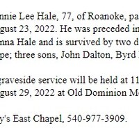 - Ronnie Lee Hale was married to Donna Hale. They had five children: Melinda, Hope, John Dalton, Byrd, Dalton and Roy Dalton. Ronnie Hale died on August 23, 2022, and is buried in Old Dominion Memorial Gardens. He lived in Roanoke.